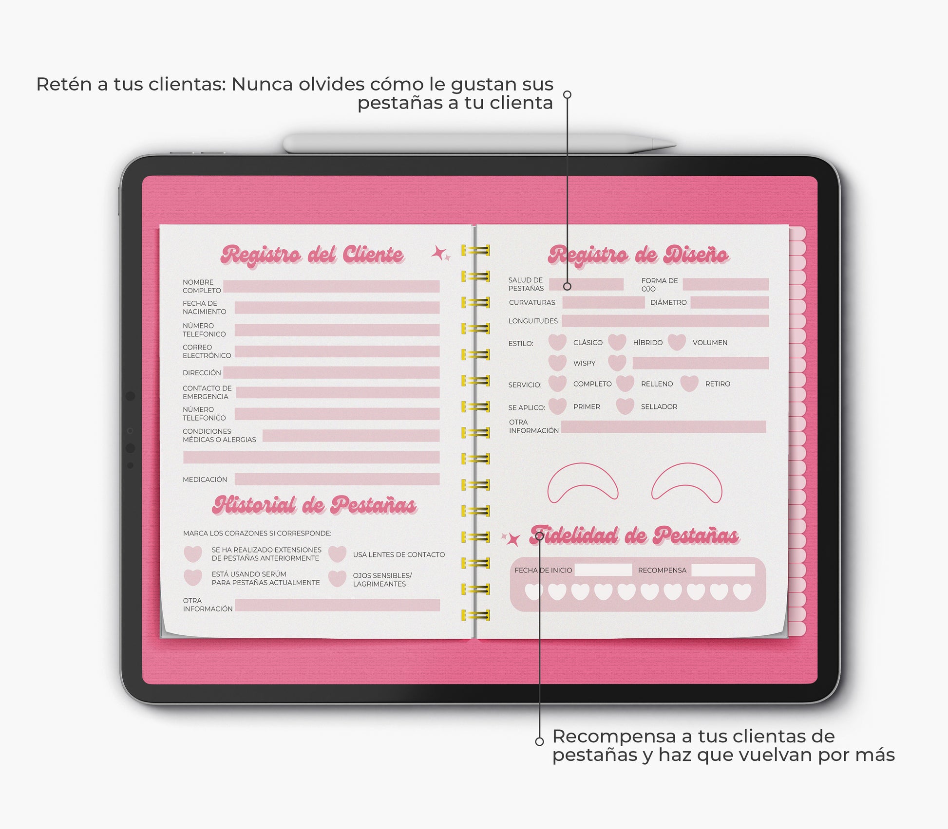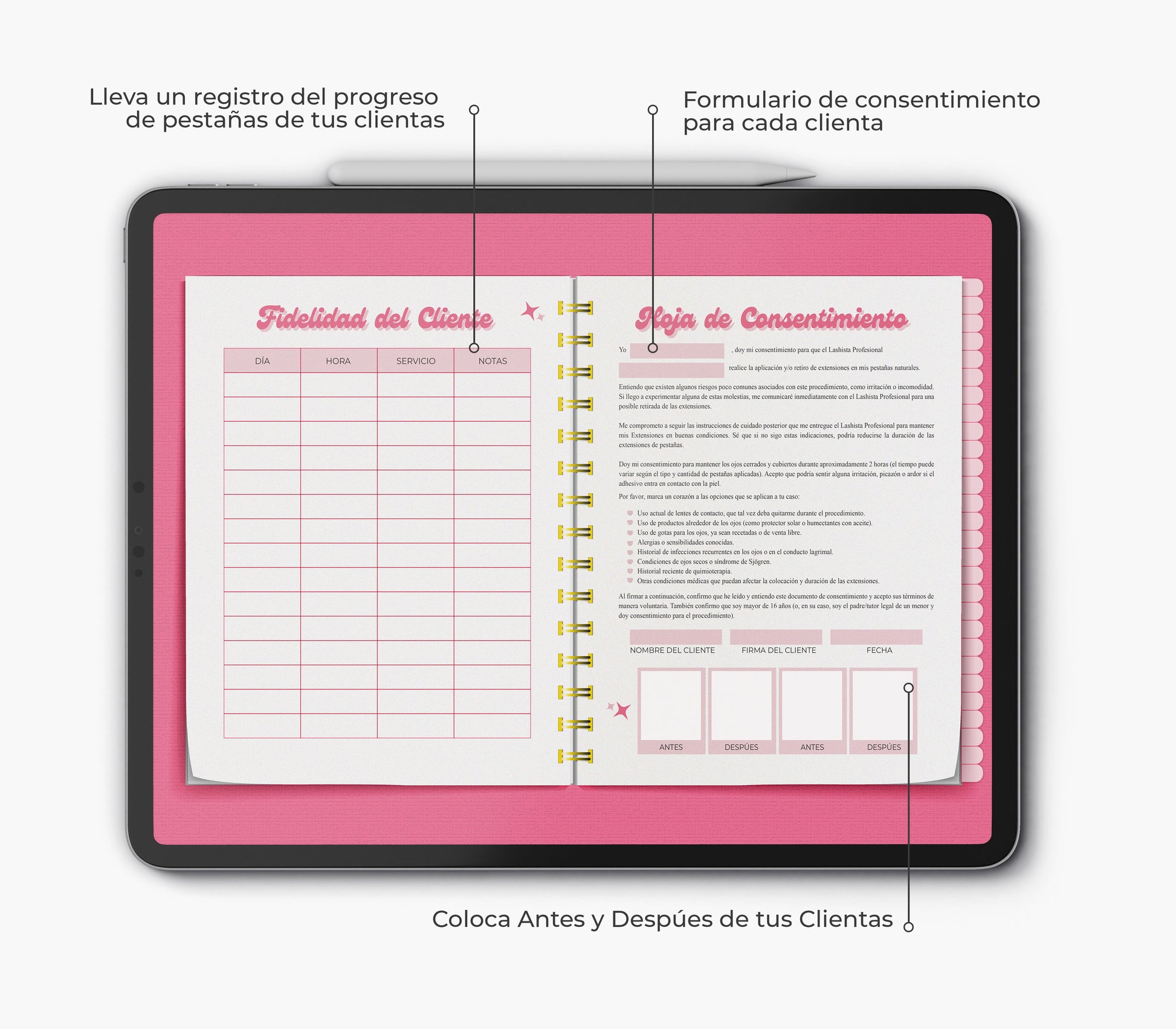 Si eres lashista profesional y buscas una herramienta digital que eleve tu negocio, este Lash Planner Digital es justo lo que necesitas. Con 500 páginas hipervinculadas, te permite gestionar cada aspecto de tus servicios de forma organizada y profesional. Ya no perderás tiempo buscando información, ya que todo está estructurado con enlaces que te llevarán al instante a la sección que necesitas.